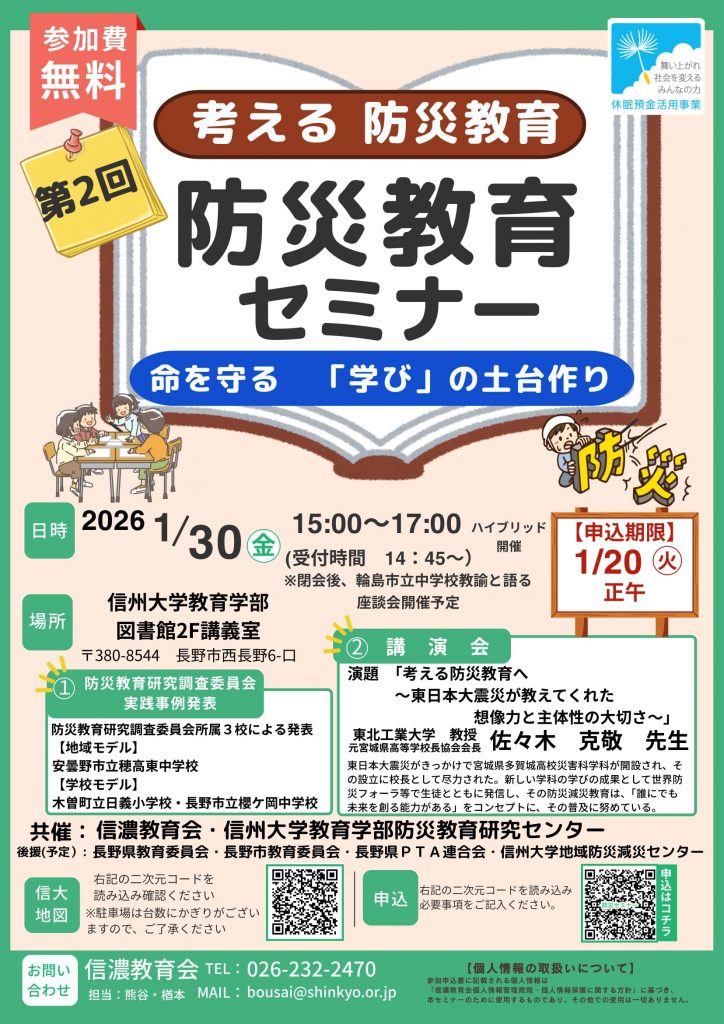Posted inイベント 【1月30日】第2回防災教育セミナー開催 Posted by admin 2026年1月5日 第2回防災教育セミナーが1月30日(金)に開催されます。詳しくは以下をご覧ください。 admin View All Posts Post navigation Previous Post 【12月13日、14日開催】信州型避難所システム実働訓練の実施のお知らせNext Post【2/20開催】令和7年度 防災学習成果発表会のお知らせ